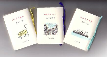 1970年、大阪千里で開かれた万国博覧会のお祭り広場で、全国で発行されていた豆本を、宮尾しげをさんのお勧めで露店で売った際に生まれた豆本です。現在までに135冊と別冊1冊、それぞれ並製と特装本2種を出してきました。内容はすべて何らかのかたちで書物にまつわるもので、特装本は、様々な材質で意匠を凝らした装丁になっています。既刊在庫目録ご請求下さい。